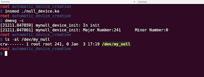 In our previous post, we have created a null device which acts a block hole. We will add logic in our driver code to avoid user using mknod to create /dev/my_null, instead allow driver to automatically create it on loading the module.